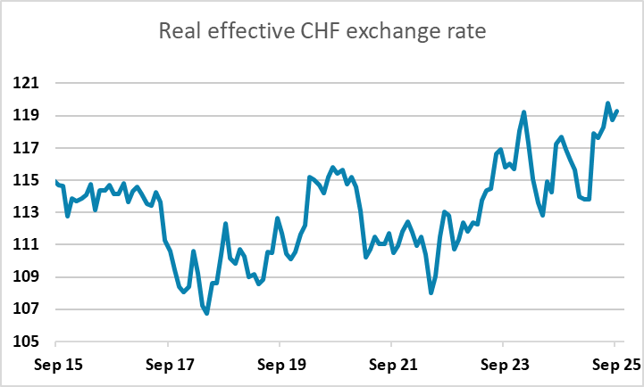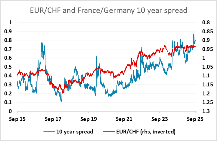 EUR/CHF has moved modestly higher in the last few days, even though risk sentiment has if anything weakened slightly due to the US government shutdown. Of course, while the CHF is traditionally a safe haven, it has remained strong in recent years despite generally positive risk sentiment and declining risk premia, so it is now probably only seen as a safe haven in relation to intra-EU tension. The France/Germany 10 year yield spread provides one measure of this, and has edged lower in the last month from the highs seen in late August. There also looks to be a strong technical base building at 0.93 in EUR/CHF, so provided that we don’t see any renewed EUR break-up concerns, there is scope for EUR/CHF to continue to edge a little higher.
