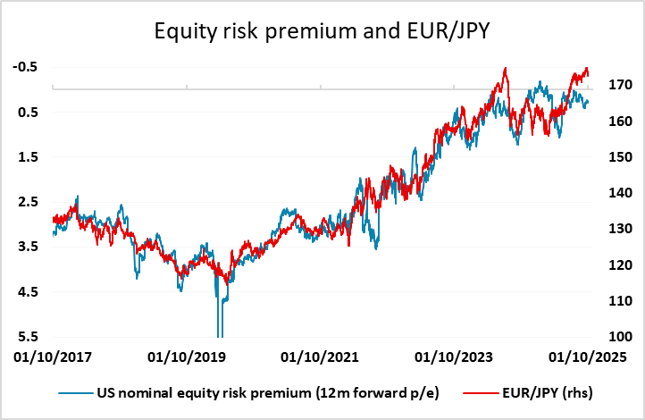 The theme on Wednesday was some continued JPY strength, encouraged both by the US government shutdown and the weaker than expected US ADP employment data which showed the largest decline since the pandemic and the third in the last four months. This certainly weighs in favour of a Fed ease in October even if there is no official data to go on by then, and should consequently be JPY supportive. Lower US yields will both reduce the spreads with the JPY and will tend to increase the implied equity risk premium, especially in a situation where activity is likely to be held back to some extent by the government shutdown. Risk premia have already risen enough to suggest scope for a EUR/JPY decline below 170, while US/Japan yield spreads suggest scope well into the 130s. CHF/JPY continues to look the most clearly overvalued pair and could have dramatic downside.