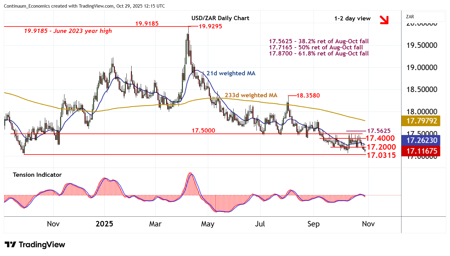 12:00 GMT - Cautious trade has given way to anticipated selling interest, with the break below 17.2000 adding weight to sentiment and putting focus on critical support at the 17.0315 year low of 30 September 2024 and the 17.0630 current year low of 9 October. Daily readings are bearish and broader weekly charts are under pressure, highlighting room for further losses in the coming sessions. A close beneath here will sentiment negative and confirm a deeper corrective of the broad 2021-2023 rally, as focus then turns to the 16.6900 monthly low of January 2023. Meanwhile, a close back above congestion resistance at 17.2000, if seen, would help to stabilise price action and prompt consolidation beneath further congestion around 17.4000.