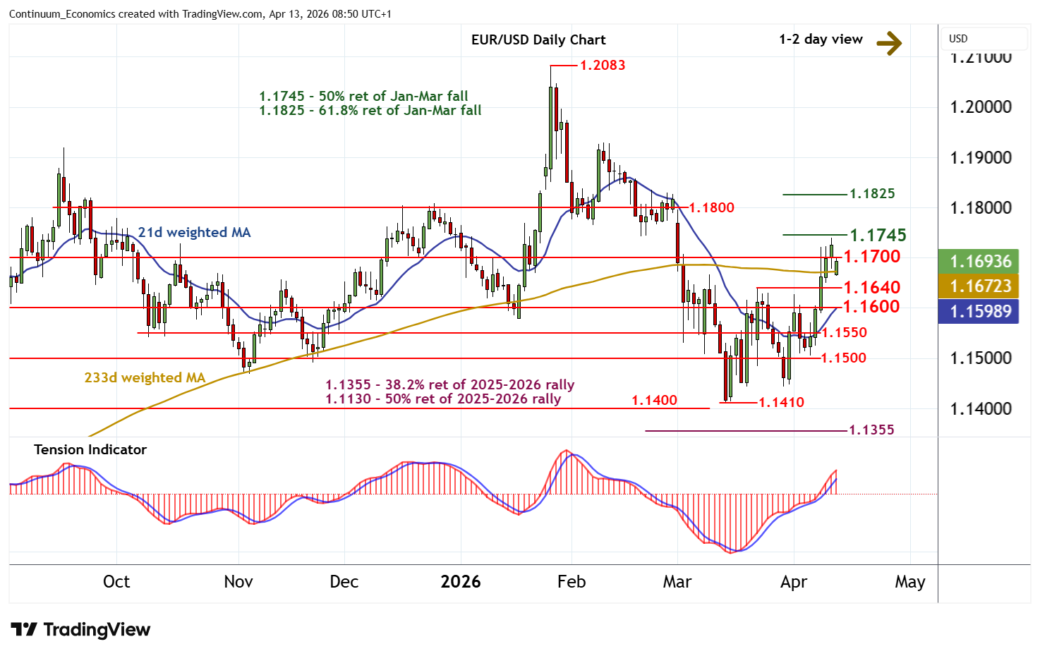 08:40 BST - The opening gap lower has bounced from 1.1665, with prices currently pressuring congestion resistance at 1.1700. Negative intraday studies and a tick lower in overbought daily stochastics should limit any immediate break above here in fresh consolidation beneath the 1.1745 Fibonacci retracement. However, the rising daily Tension Indicator and improving weekly charts point to later strength. A close above 1.1745 will improve sentiment and extend mid-March gains towards 1.1800/25, where fresh selling interest is expected to appear. Meanwhile, support remains down to the 1.1640 weekly high of 23 March and should underpin any immediate setbacks.