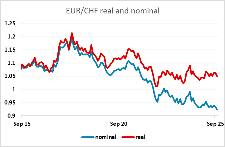 For most European currencies the picture looks more neutral. Risk sentiment remains reasonably positive, with the PMIs last week suggesting some improvement in growth prospects, even though the divergence between French and German PMIs is a mild cause for concern. The USD index continues to broadly follow the path seen under the first Trump administration, and this suggests we could see a rangy picture in EUR/USD until the end of the year. The CHF stands out as the strongest of the European currencies, having tested the lows just above 0.92 that have market the bottom for EUR/CHF over the past year. The November low of 0.9204 is the all time low if the 2015 spike low is excluded. While the CHF is slightly less strong than this suggests in real terms, it is nevertheless by some way the strongest currency in the G10 world relative to PPP, despite zero rates and a generally risk positive environment. Divergence within the Eurozone between French and German growth could be seen as a CHF positive factor, as there is some correlation between EUR/CHF and intra-Eurozone yield spreads. But it’s hard to see the case for a break to effective new all time lows at this stage, so EUR/CHF should be near a bottom.