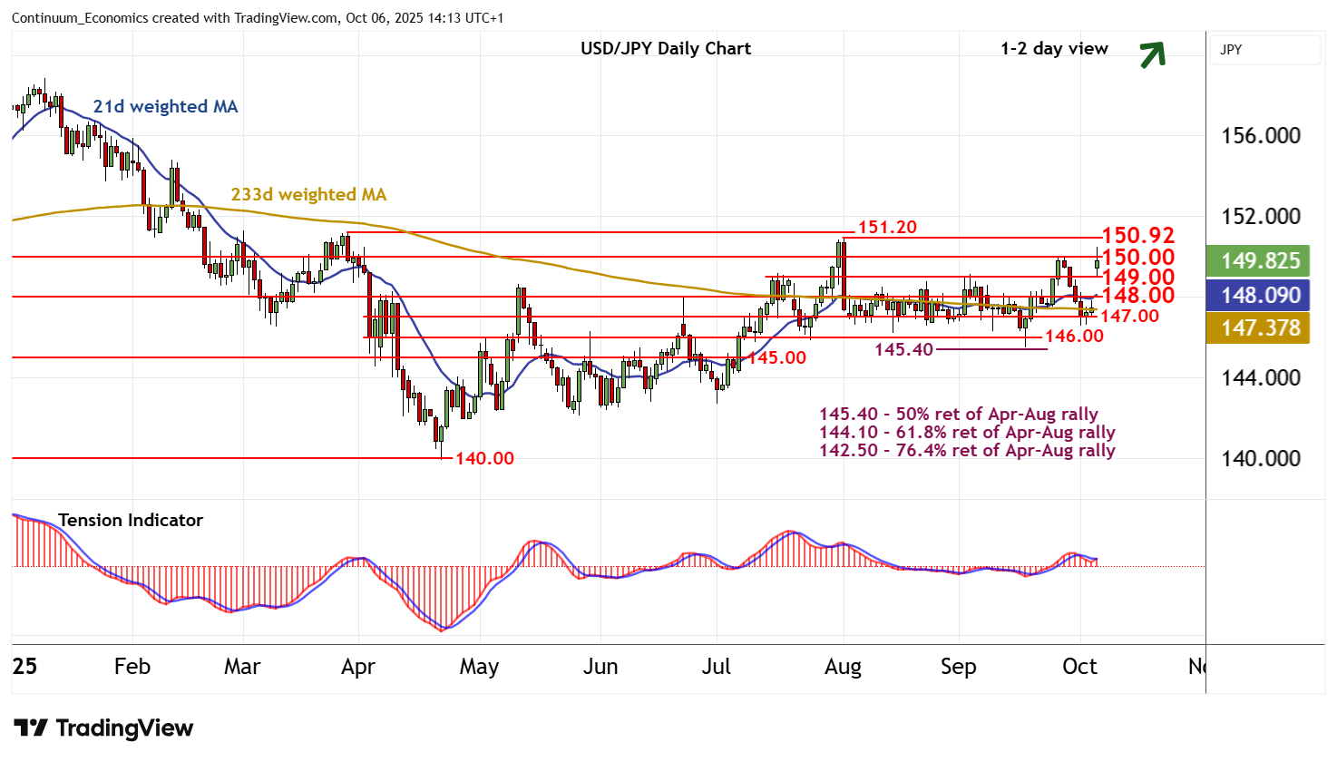 14:00 BST - Sharp JPY-driven gains have spiked above congestion resistance at 150.00, reaching 150.45~ before settling back below 150.00 as overbought intraday studies unwind. Daily readings have turned higher and broader weekly charts are mixed/positive, highlighting room for further strength in the coming sessions. A close above 150.00 will open up strong resistance at the 150.92 monthly high of 1 August and the 151.20 monthly high of 28 March. A further close above here is needed to turn sentiment positive and confirm continuation of April gains, initially to congestion around 152.00. Meanwhile, support is raised to congestion around 149.00. A close beneath here would turn sentiment neutral and prompt consolidation above 148.00.