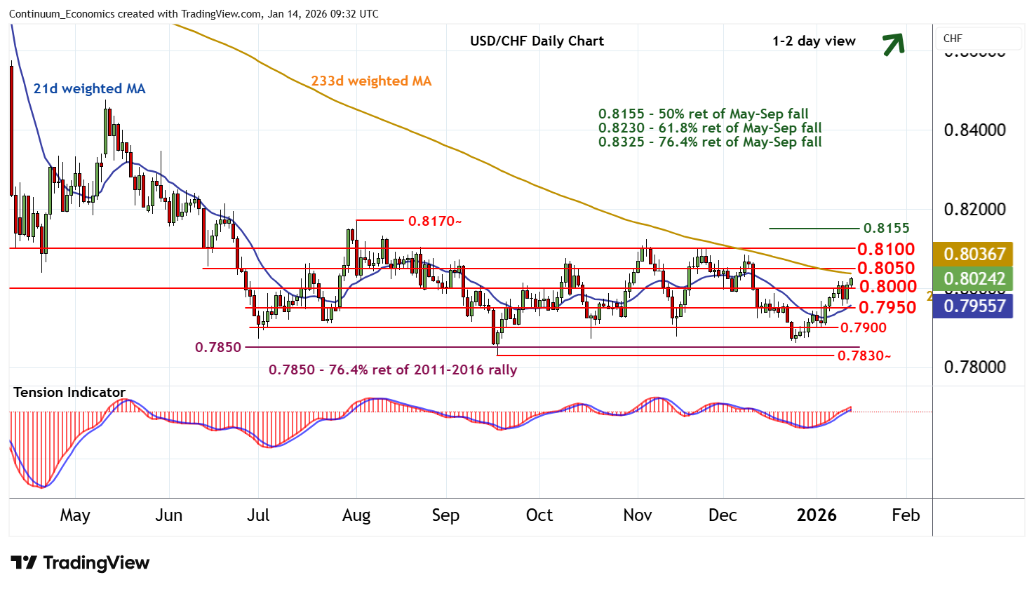 09:20 GMT - Cautious trade has given way to a push higher in CHF-driven trade, with the break above 0.8000 currently trading around 0.8025. The rising daily Tension Indicator highlights room for a test of resistance at 0.8050. But flat overbought daily stochastics are expected to limit any initial tests in consolidation, before positive weekly charts extend late-December gains towards 0.8100. Meanwhile, a close back below congestion support at 0.8000 would turn sentiment neutral once again and prompt consolidation above 0.7950.