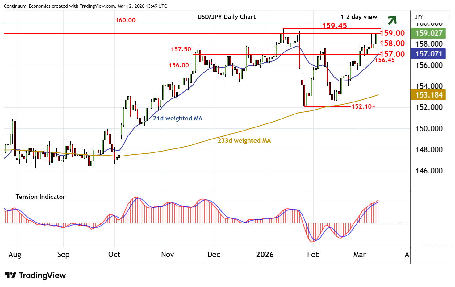 13:40 GMT - Little change, as prices consolidate the test of resistance at the 158.90 high of 9 March and congestion around 159.00. Daily readings continue to rise and broader weekly charts are positive, highlighting room for further strength in the coming sessions. A close above critical resistance at the 159.45 current year high of 14 January is needed to turn sentiment positive and extend long-term bullish trends towards fresh resistance within 160.00/40. Meanwhile, support remains at the 158.00 break level. Any tests beneath here should give way to consolidation above 157.00.