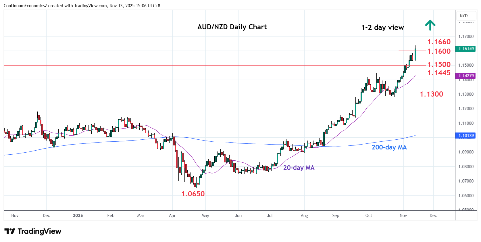 07:00 GMT - Consolidation below the 1.1600 level has given way to break to reach fresh high at 1.1636. Higher still, will see room to extend gains from the March 2020 year low and parity level to resistance at 1.1660, September 2013 high. However, deep overbought daily and weekly studies caution corrective pullback with support raised to 1.1525/1.1500 congestion area. Below this will open up room for deeper pullback to retrace strong gains from the 1.0650 April current year low and see room to 1.1445/1.1400, October high and congestion area.