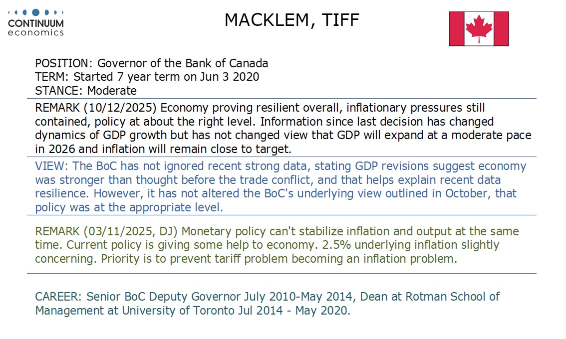 A key sentence in Macklem’s statement was that “while information since the last decision has affected the near-term dynamics of GDP growth, it has not changed our view that GDP will expand at a moderate pace in 2026 and inflation will remain close to target.“ The Bank of Canada remains comfortable with the 2.25% rate, at the bottom end of its neutral range of 2.25%-3.25%. However, the statement notes that this assumes the economy evolving broadly in line with its October projection. Data so far can still be seen as broadly in line with October’s projection, particularly if Q4 GDP comes in significantly below an October projection of 1.0% annualized. In 2026 GDP is expected to rise by 1.6% Q4/Q4. If GDP data in early 2026 comes in significantly stronger than that, and inflation does not move closer towards the 2.0% target after tax distortions fade, tightening could start to be debated, though we feel data will be more in line with the BoC’s October forecasts, and tightening will not be seen until Q4 2026. Recent data has reduced the risk of further easing, but it is not to be ruled out should a significant deterioration in the data be seen.