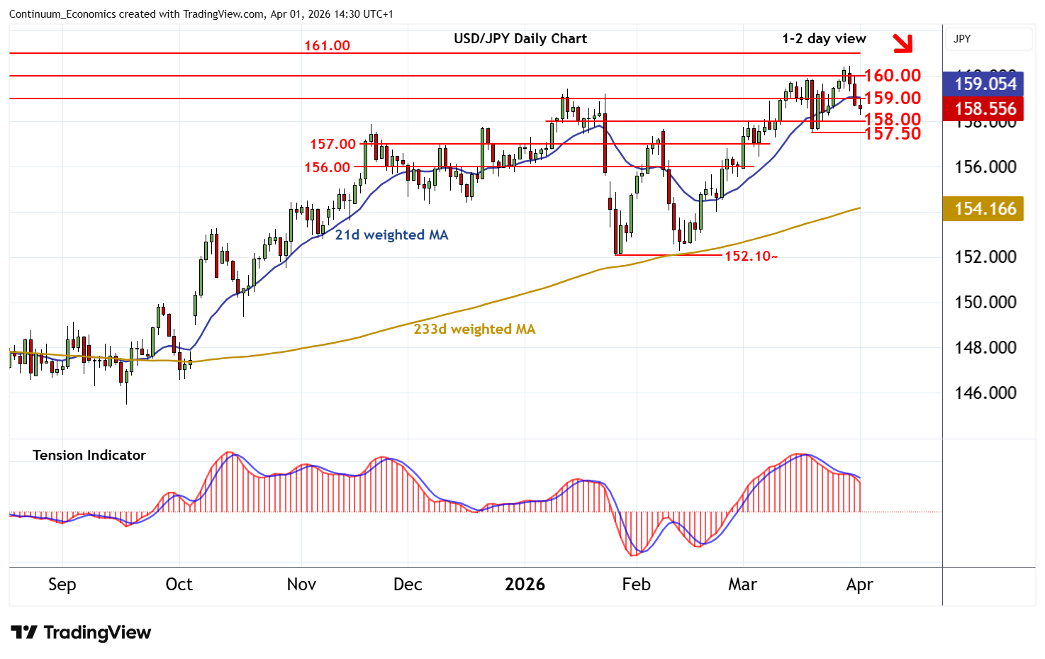 14:10 BST - Little change, as the anticipated break below 159.00 gives way to minor consolidation around 158.50. Daily readings are under pressure and positive weekly stochastics are turning down, highlighting room for further losses towards support at 158.00. Just beneath here is the 157.50 weekly low of 19 March, but already oversold daily stochastics should limit any initial tests of here in consolidation. A close beneath here, however, will add weight to sentiment and confirm a deeper pullback, initially to congestion around 157.00. Meanwhile, resistance is lowered to congestiona round 159.00. A close above here would help to stabilose price action and prompt consolidation beneath 160.00.