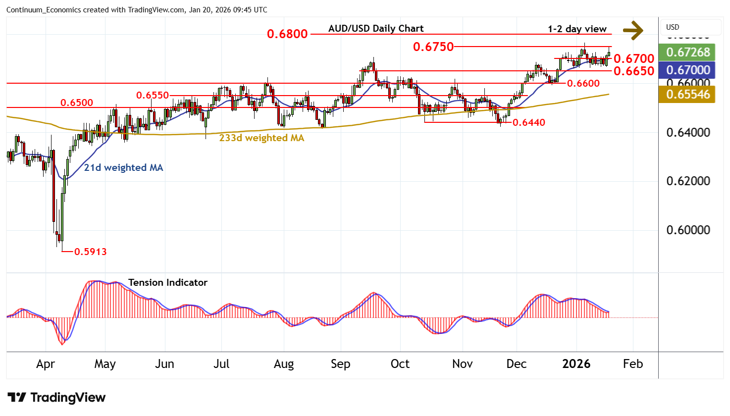 09:25 GMT - The break above 0.6700 has met selling interest just beneath congestion resistance at 0.6750, as overbought intraday studies unwind, with prices currently balanced around 0.6725. Oversold daily stochastics are unwinding and the flat daily Tension Indicator is rising, highlighting room for a break above 0.6750 and a test of the 0.6765~ current year high of 7 January. Broader weekly charts have also ticked up. But a close above 0.6750/65~ is needed to turn sentiment positive and extend April 2025 gains, initially towards 0.6800. Meanwhile, a close back below congestion support at 0.6700 will help to stabilise price action and prompt consolidation above further congestion around 0.6750.
