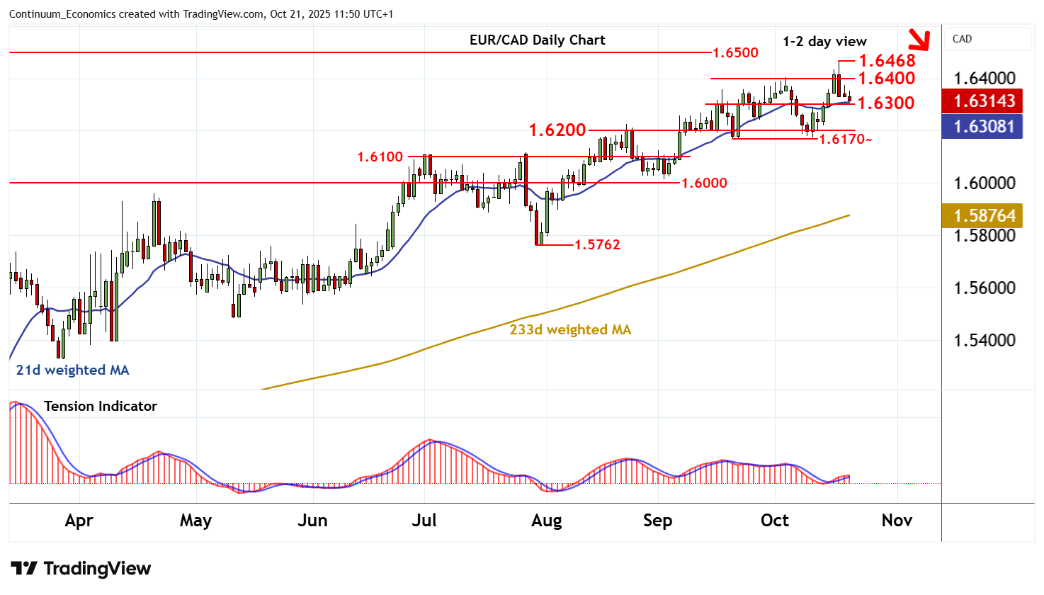 11:15 BST - Cautious trade is giving way to a drift lower, as intraday studies turn down, with focus turning to congestion support at 1.6300. Daily readings are also under pressure and broader weekly charts are mixed/negative, suggesting room for a later break. Focus will then turn to further congestion around 1.6200 and the 1.6170~ weekly lows from mid-September to mid-October. However, by-then oversold daily stochastics could limit any initial tests of this range in fresh consolidation. Meanwhile, resistance remains at congestion around 1.6400 and should cap any immediate tests higher.