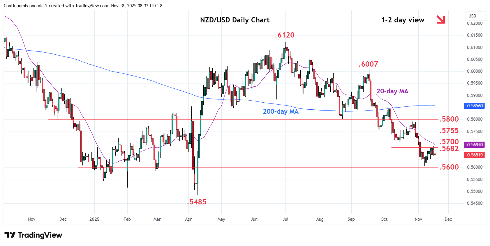 Leaning lower in range as resistance at the .5682/.5700 area caps and see pressure returning to the .5650/45 congestion