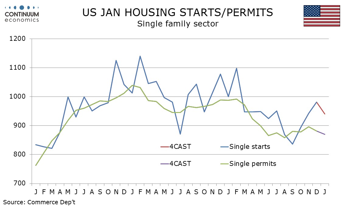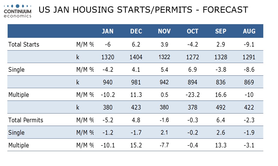 We expect January housing starts to fall by 6.0% to 1.32m to follow a 6.0% December increase while permits fall by 5.2% to 1.38m to follow a 4.8% December increase. Underlying slowing in demand and bad weather are both likely to contribute to the decline, with the latter impacting starts more than permits.