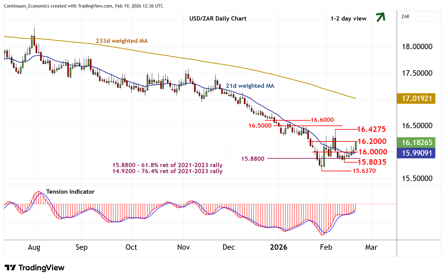12:25 GMT - Cautious trade is giving way to anticipated tests higher, as intraday studies improve, with prices currently pressuring congestion resistance at 16.2000. Daily readings are positive and broader weekly charts have turned mixed/positive, suggesting room for further strength in the coming sessions. A break above here will open up the 16.4275 weekly high of 6 February. But already overbought daily stochastics could limit any initial tests in profit-taking/consolidation. Meanwhile, a break below congestion support at 16.0000, if seen, will stabilise price action and prompt consolidation above the 15.8035 weekly low of 12 February.