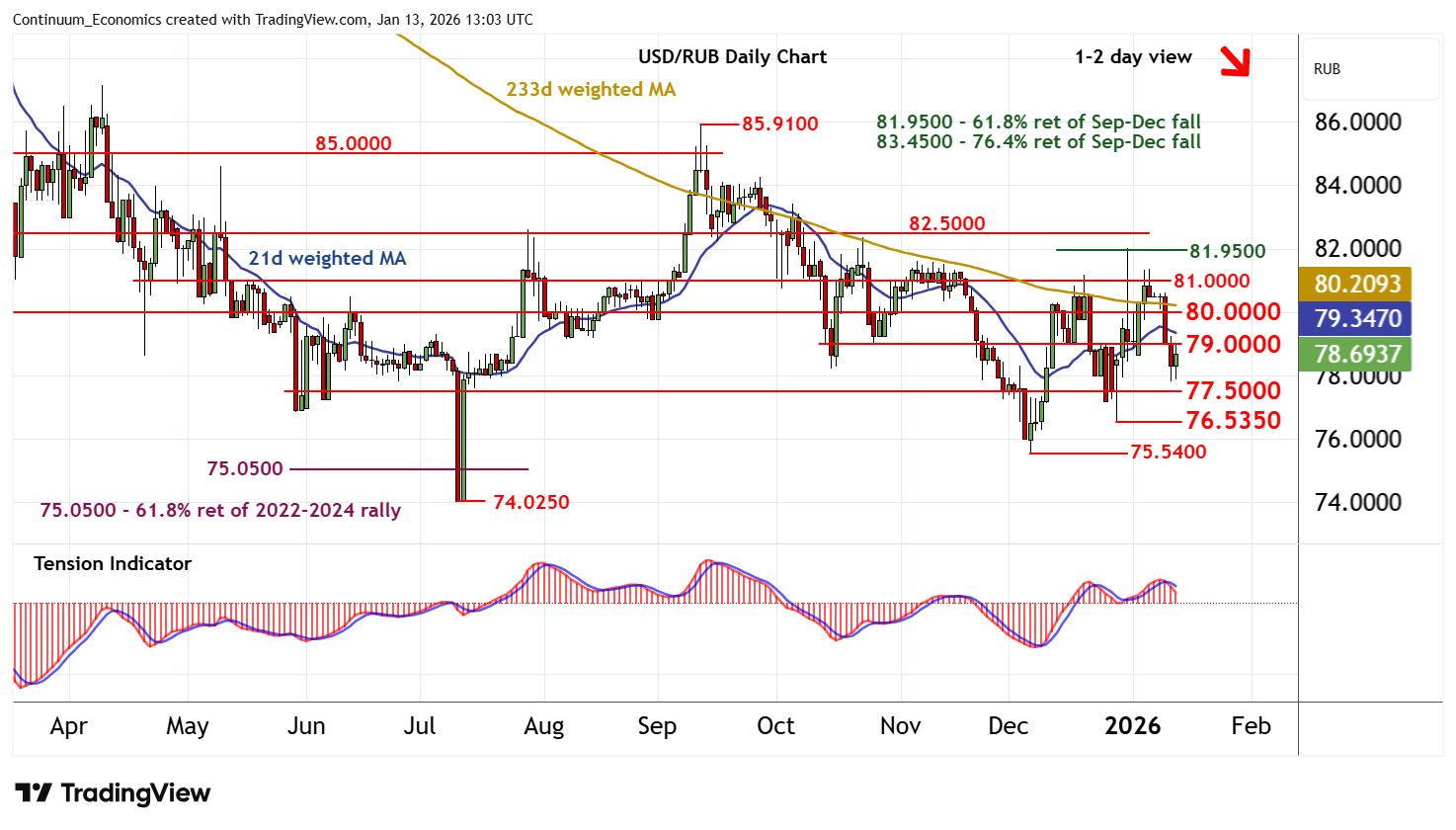 12:30 GMT - The anticipated break below 79.0000 has bounced from just below 78.0000, with prices currently trading around 78.8500. Daily stochastics and the daily Tension Indicator continue to track lower, highlighting room for a test of congestion support at 77.5000. But rising weekly charts should limit any break in renewed buying interest towards the 76.5350 weekly low of 29 December. Meanwhile, resistance is lowered to 79.0000. A close above here, if seen, will help to stabilise price action and prompt consolidation beneath congestion around 80.0000.