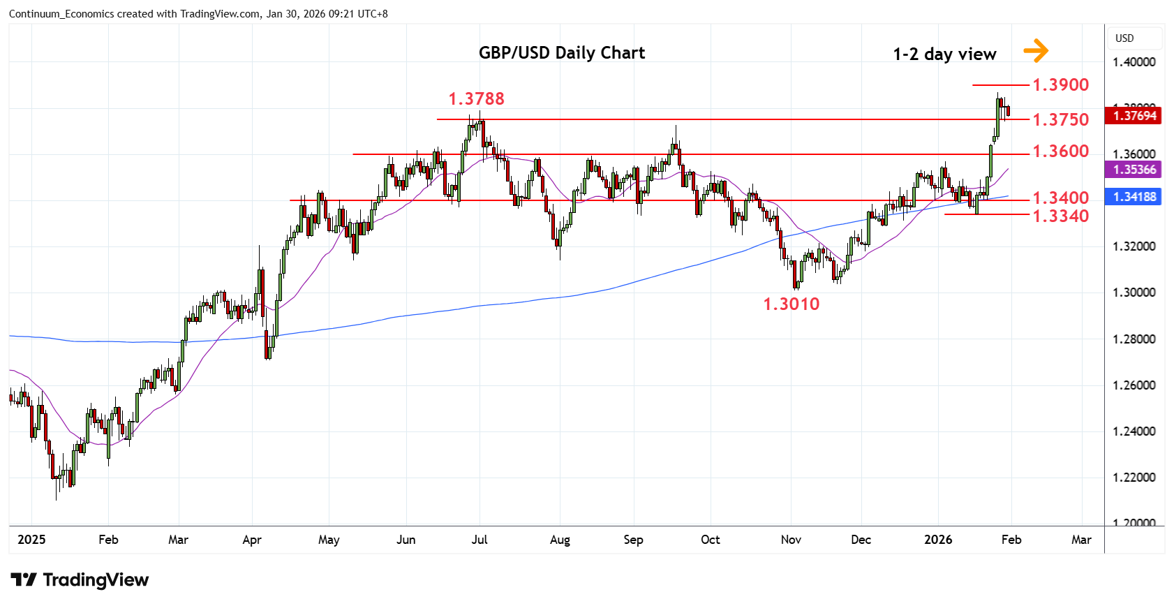 01:25 GMT - Lower in range from the Tuesday's 1.3869 high as prices consolidate strong gains from the 1.3340 low of last week. Pullback see prices unwinding overbought intraday and daily studies with support starting at the 1.3750/1.3700 congestion area which is expected to underpin. Break here will open up room for deeper correction to 1.3600/1.3568 support. Correction is expected to give way to renewed buying interest later. Above 1.3869 high will extend the broader gains from 2022 year low and see room for extension to the September 2021 high at 1.3910 then the 1.4000 figure.