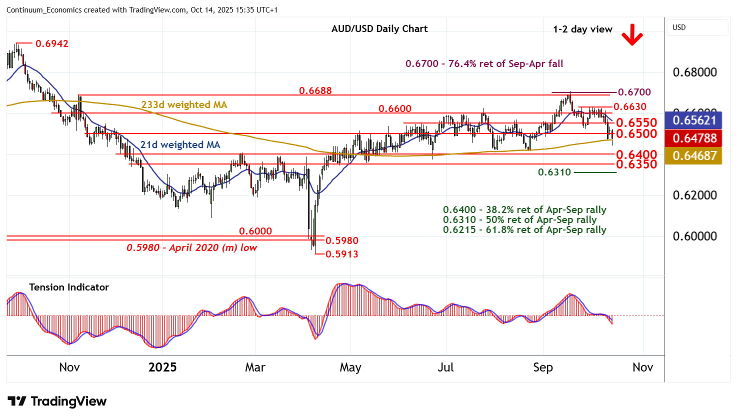 16:40 BST - The anticipated break below 0.6500 has reached 0.6440, where mixed intraday studies are prompting short-term reactions. Daily readings continue to deteriorate and broader weekly charts are under pressure, suggesting room for fresh losses in the coming sessions. A break below 0.6440 will add weight to sentiment and open up stronger support at congestion around 0.6400. Oversold daily stochastics could limit any initial tests in consolidation. Meanwhile, resistance is lowered to congestion around 0.6500. A break above here would help to stabilise price action and give way to consolidation beneath 0.6550.
