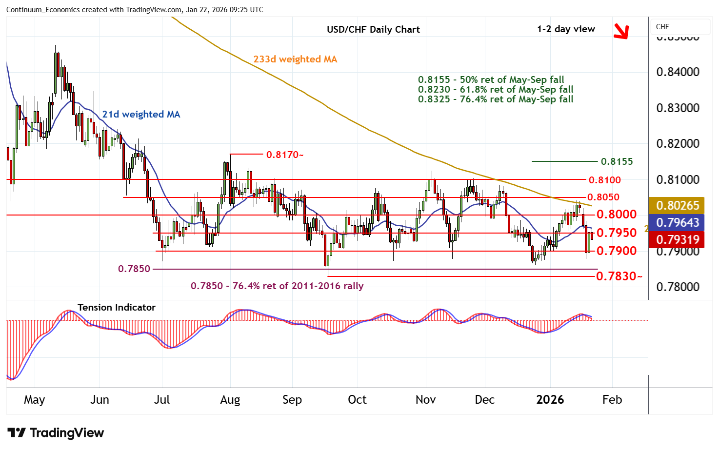 09:15 GMT - The anticipated bounce has reached congestion resistance at 0.7950, where overbought intraday studies are prompting fresh selling interest. Daily stochastics and the daily Tension Indicator are under pressure, highlighting room for a retest of congestion support at 0.7900. However, mixed weekly charts should limit any initial break in consolidation above critical support at the 0.7850 Fibonacci retracement and the 0.7830~ year low of 17 September 2025. A further close beneath here will add weight to sentiment and extend December 2016 losses initially to 0.7800. Meanwhile, a close above 0.7950, if seen, will help to stabilise price action and prompt consolidation beneath further congestion around 0.8000.