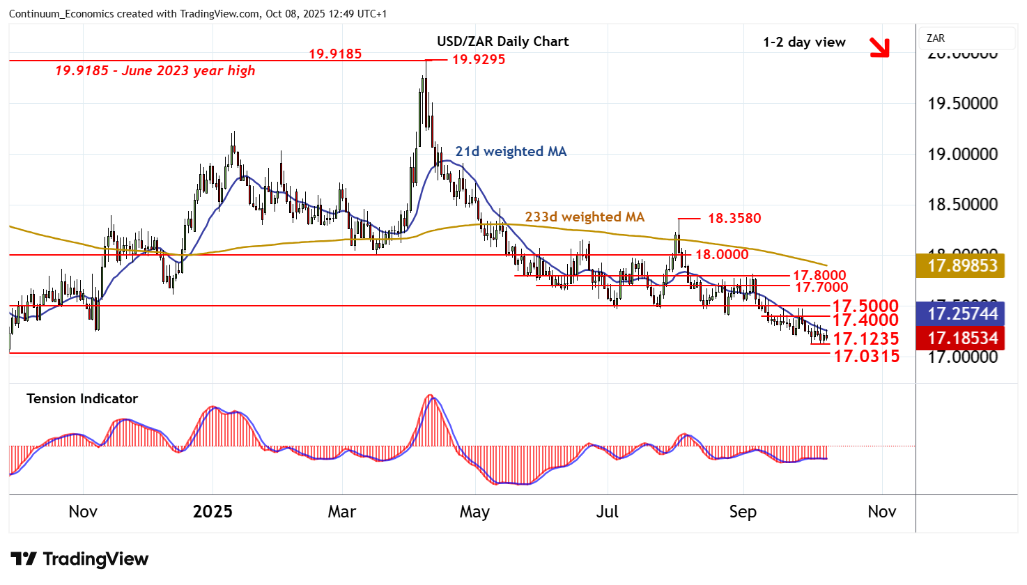 12:30 BST - Still little change, as prices extend consolidation above support at the 17.1235 current year low of 1 October. Daily readings are mixed/negative and broader weekly charts are coming under pressure, highlighting room for fresh losses in the coming sessions. A later break below 17.1235 will open up critical support at the 17.0315 year low of 30 September 2024. A close beneath here would turn sentiment outright negative and confirm continuation of May 2023 losses. Meanwhile, resistance remains at 17.4000 and extends to congestion around 17.5000. This range should cap any immediate tests higher. A close above here, if seen, will improve price action and prompt fresh gains towards 17.7000 - 17.8000.
