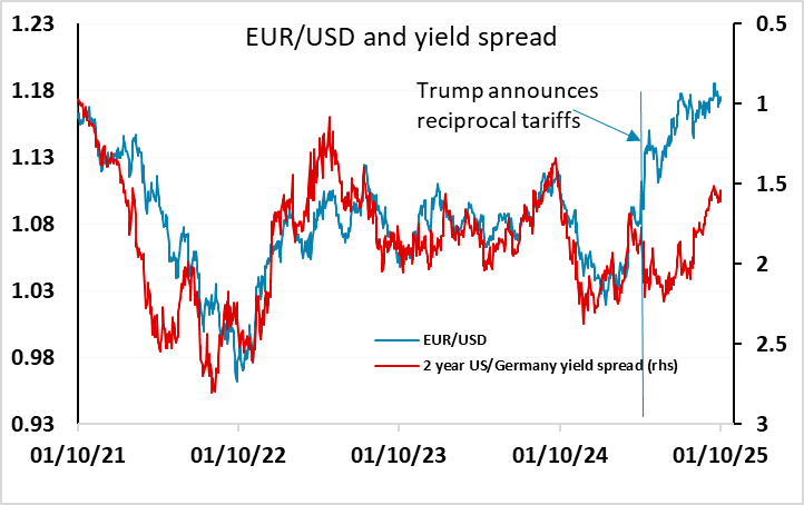 The USD has fallen across the board in reaction to the data, with US yields down around 5bps across the curve. The yield decline has prevented a negative equity market reaction, but ought to mean that the JPY is the best performer going forward, as the yield decline implies a further rise in the equity risk premium, which was already suggesting scope for JPY gains on the crosses. Upside for EUR/USD looks more limited with the EUR having outperformed yield spreads earlier this year, but the USD is likely to edge lower even against the riskier currencies as long as equity markets hold up.