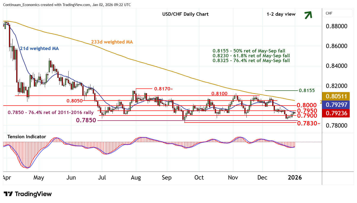 09:20 GMT - Little change, as prices extend cautious/choppy trade around 0.7930. Rising daily stochastics and a tick higher in the daily the daily Tension Indicator highlight room for a test of congestion resistance at 0.7950. But negative weekly charts should limit any break in renewed selling interest beneath further congestion around 0.8000. Following cautious trade, fresh losses are looked for. Immediate support remains at congestion around 0.7900. But a close below critical support at the 0.7850 Fibonacci retracement and the 0.7830~ year low of 17 September 2025 is needed to add weight to sentiment and extend long-term losses initially towards 0.7800.