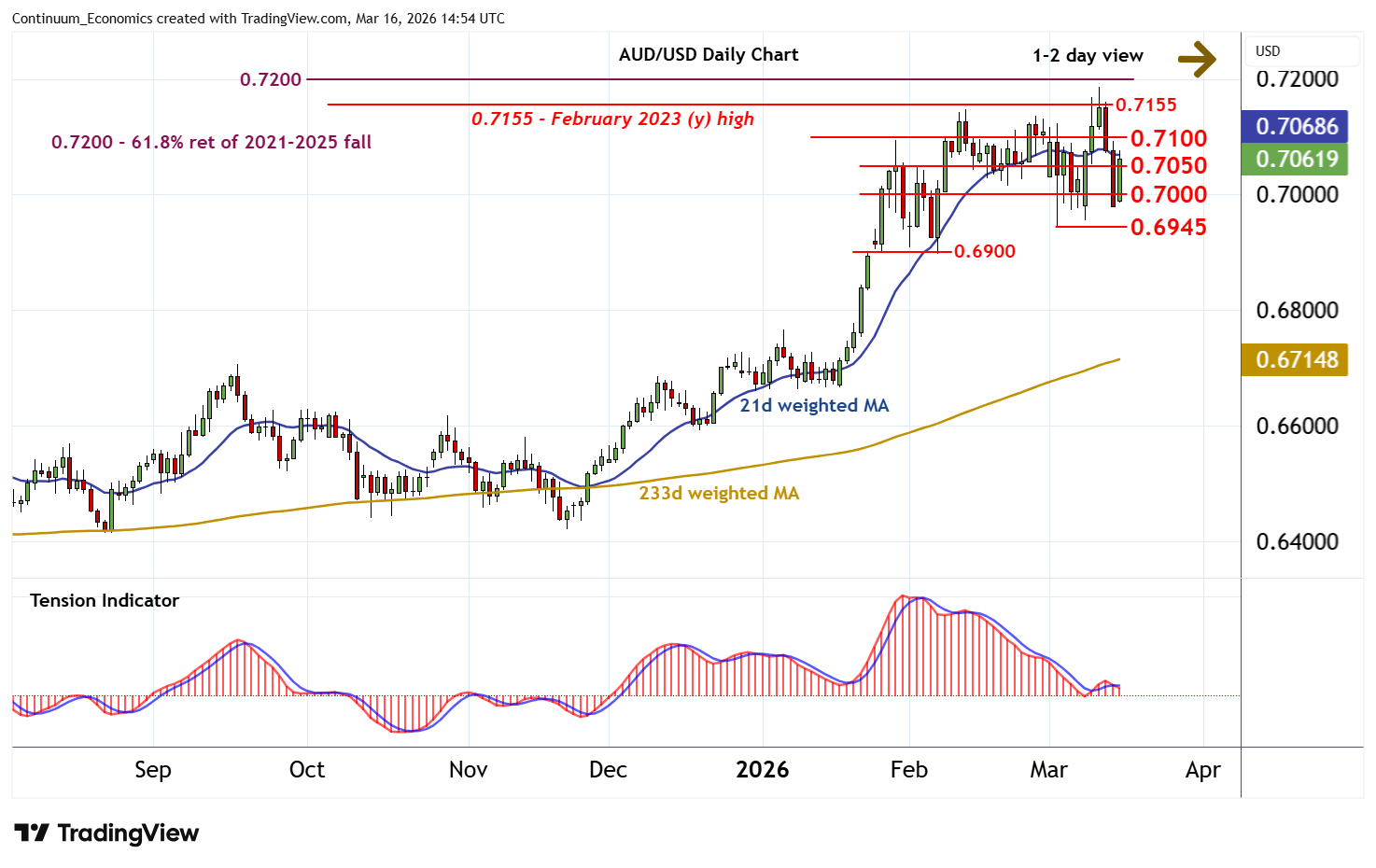 14:50 GMT - The anticipated break below congestion support at 0.7000 has bounced smartly from 0.6975/80, as oversold intraday studies unwind, with prices currently trading around congestion resistance at 0.7050. Beyond here is the 0.7100 break level. But negative daily and weekly readings should limit any extension towards here in renewed selling interest/consolidation. In the coming sessions, cautious trade is expected to give way to fresh losses. Support is at 0.7000. But a further close below the 0.6945 weekly low of 3 March is needed to turn sentiment negative and confirm a deeper correction, as focus then turns to 0.6900.