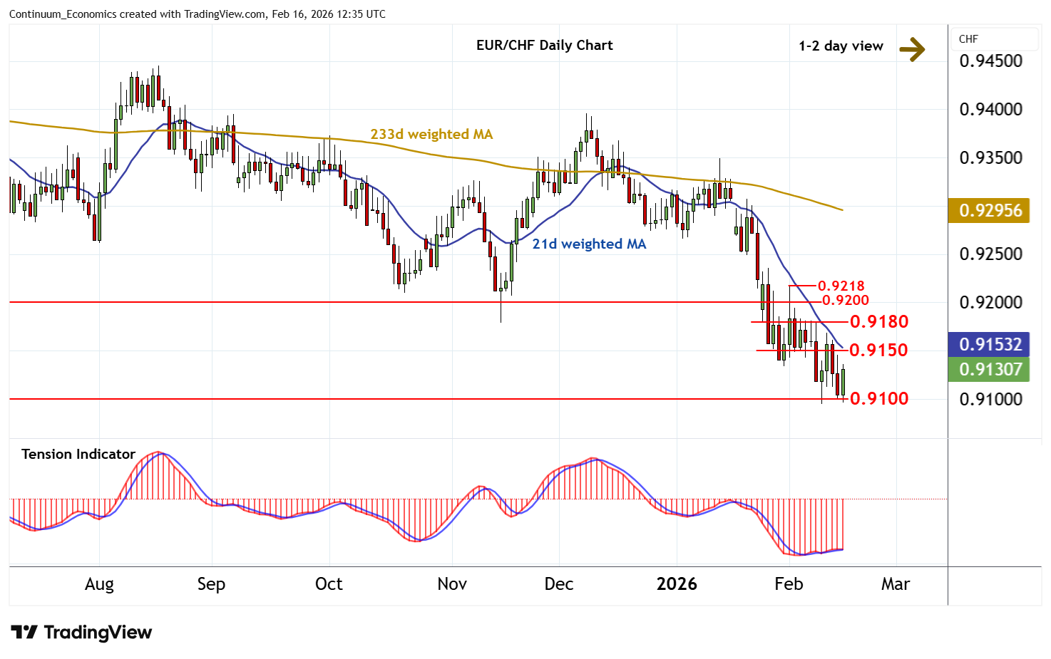 12:25 GMT - Still little change, as prices extend cautious trade within the 0.9100 - 0.9150 range. Intraday studies are rising, highlighting room for a test of 0.9150. But mixed/negative daily and weekly readings should prompt renewed selling interest towards here. A close above 0.9150, if seen, will help to stabilise price action and give way to consolidation beneath congestion around 0.9180. Following cautious/corrective trade, fresh losses are looked for. A close below support at the 0.9095 current year low of 10 February and 0.9100 will add weight to sentiment and extend losses to fresh lows towards 0.9000.