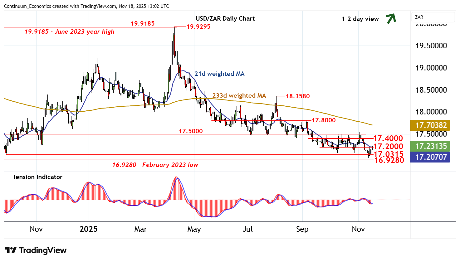 12:40GMT - Anticipated gains are currently testing levels just above congestion resistance at 17.2000. Intraday studies are mixed/positive and oversold daily stochastics are unwinding, highlighting room for extension towards further congestion around 17.4000. However, mixed weekly charts are expected to limit any initial tests in renewed selling interest/consolidation. Meanwhile, support remains at the 17.0315 year low of 30 September 2024 and extends to the 16.9495 current year low of 13 November. This range should underpin any immediate setbacks.