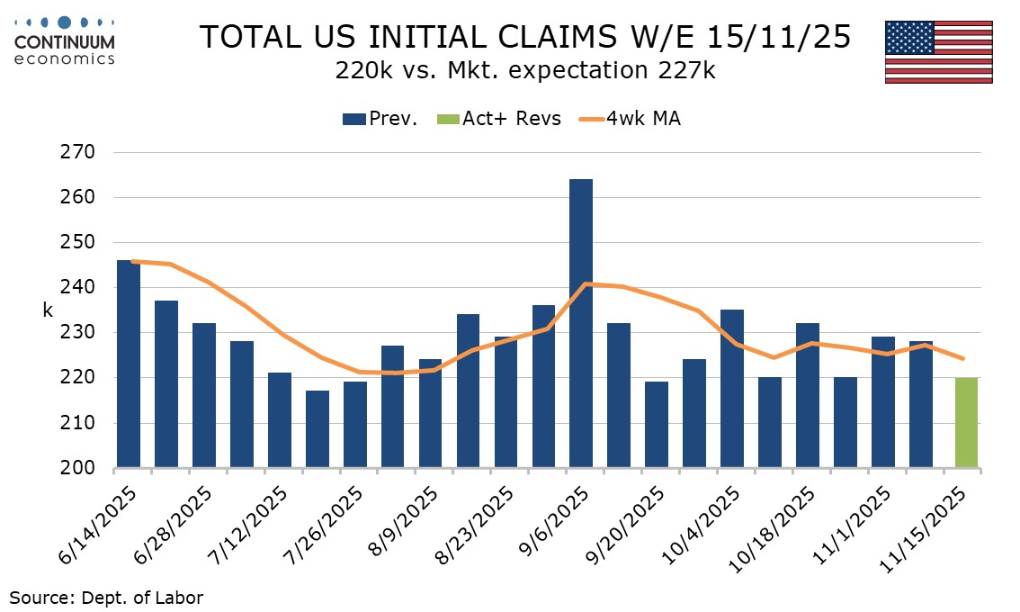 Initial claims at 220k in the week to November 15 are very similar to a 219k seen in the week to September 20, the last release before the government shutdown. Both those releases are on the low side of trend, with the high in the last eight weeks being 235k in the week to October 4.