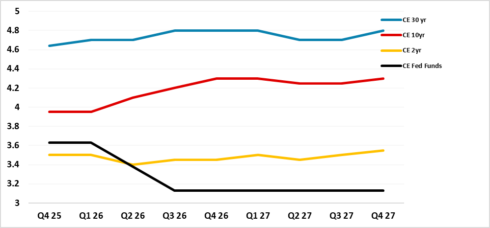 · The critical question is how much the U.S. economy is slowing with the feedthrough of President Donald Trump’s tariffs boosting inflation and restraining GDP growth, with the effective rate currently around 17% on U.S. imports. Some of this has occurred in 2025, but it will still feedthrough in 2026. Additionally, we expect the Supreme Court to reject part or all Trump’s reciprocal tariffs (here), which will add to uncertainty and the Trump administration will likely result in some alternative tariffs but also try to get trade framework to become actual trade deals and tariffs. Even so, our economic baseline remains for a slowing rather than a hard landing for the U.S., with tax cuts from the 10yr budget bill being mildly stimulative in H1 2026. The December FOMC meeting is a close call and for now we are penciling in a further 25bps cut from the Fed. More importantly, we then see the Fed pausing in Q1, as the inflation/growth picture warrants patience. We see a further two 25bps cuts before the Fed pausing throughout 2027 (Figure 2). While Trump appointees will increase at the Fed, they are unlikely to dominate voting or actual policy rate levels but could led to internal Fed disagreements and communication problems.