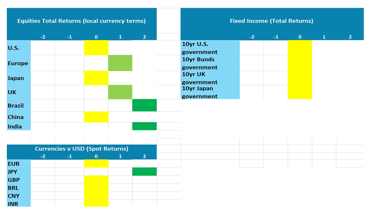 For other DM equity markets, we can see modest outperformance versus the U.S. by end 2026 (Figure 1), given less stretched valuations in equity or equity-bond comparables. Even so, EZ equities will face the headwind of a slow recovery; UK equities face lingering fiscal and political concerns, while Japan equities look overdone on the actual fiscal easing that will likely be seen.