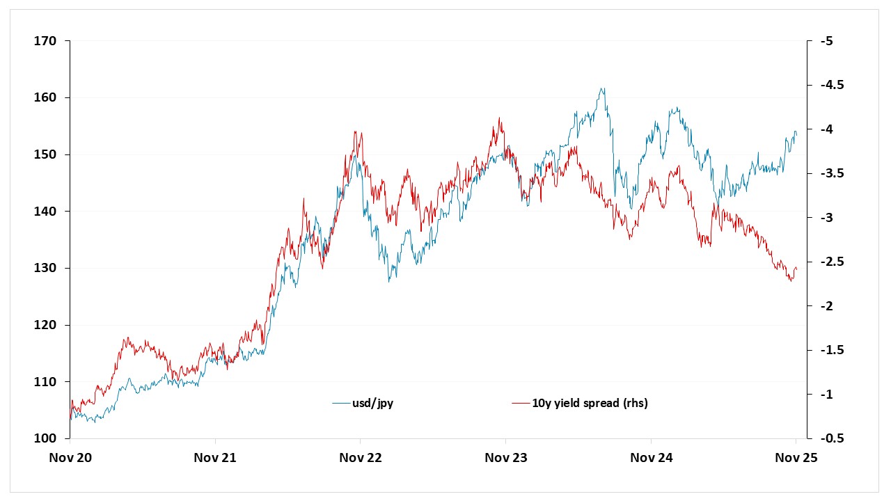 In DM FX, the JPY has been weak with the change of LDP leader, but also the inverse relationship with the buoyant and overvalued U.S. equity market. Though this can carry on in the near-term, the JPY is once again undervalued versus fundamentals such as the 10yr U.S.-Treasury-JGB spread. We can see JPY appreciation in 2026 and our end 2026 forecast is now 140 (here). The USD can decline further against other DM currencies, but will likely be less than 2025. For example, we see EUR/USD at 1.20 by end 2026, which reflects the impact of further Fed easing and further multi-year unwinding of USD overvaluation.