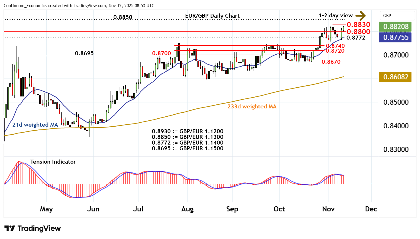 08:45 GMT - Little change, as mixed daily readings keep sentiment cautious and extend consolidation beneath strong resistance at the 0.8830 current year high of 5 November. Broader weekly charts continue to rise, highlighting room for fresh gains in the coming sessions. But a close above here is needed to turn sentiment positive and extend broad December 2024 gains initially towards strong resistance at 0.8850. Meanwhile, support is raised to 0.8800. A close beneath here will open up congestion above 0.8772, (GBP/EUR 1.1400), where fresh consolidation is expected to appear.