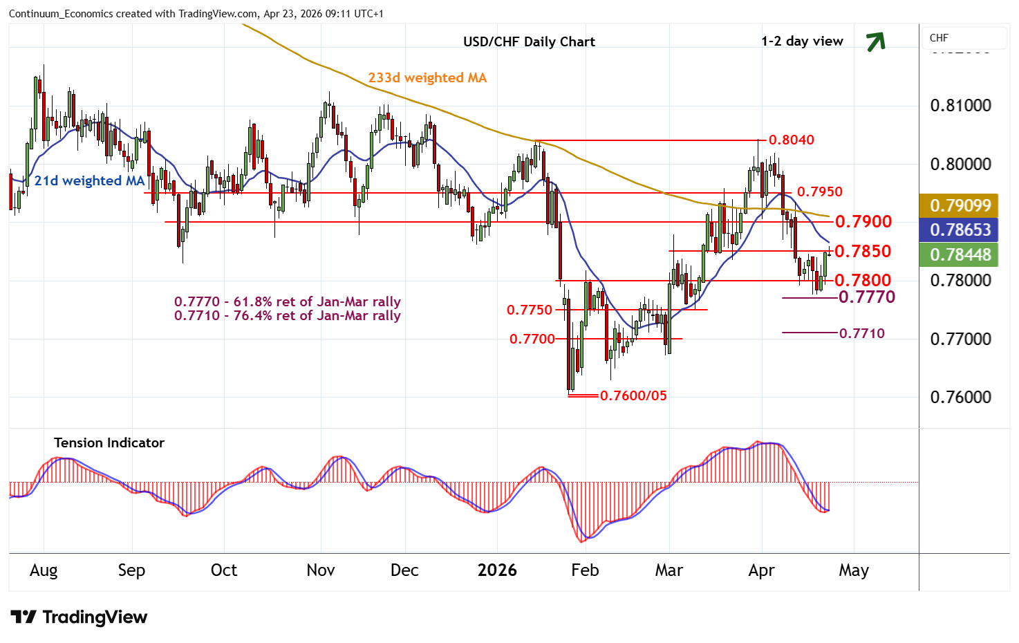 09:00 BST - Cautious trade around 0.7800 has given way to a sharp bounce to congestion resistance at 0.7850, where unwinding overbought intraday studies are prompting short-term reactions. Oversold daily stochastics are unwinding and the daily Tension Indicator has turned positive, highlighting an improvement in sentiment and room for further gains in the coming sessions. A break above 0.7850 will open up further congestion around 0.7900. But deteriorating weekly charts should limit any initial tests in renewed selling interest/consolidation. Meanwhile, support is raised to congestion around 0.7800 and extends to the 0.7770 Fibonacci retracement. A close beneath here, not yet seen, will turn sentiment negative and extend late-March losses below congestion around 0.7750 towards strong support at 0.7700/10.
