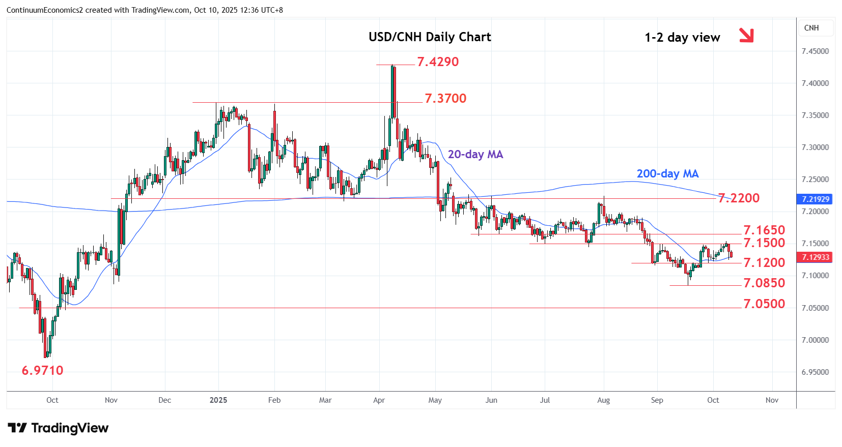 04:40 GMT - Under pressure following rejection from the 7.1500 resistance as prices unwind the overbought intraday and daily studies. Pullback see support at the 7.1200/7.1100 area which is expected to underpin. Failure to hold this will fade the upside pressure and return focus to the 7.1000 congestion and 7.0850 low. Meanwhile, resistance is at the 7.1500 congestion. Would take break here to confirm a bottom pattern at the 7.0850 low and open up room for stronger gains to retrace the April/September losses to the 7.1650/80 resistance and 7.1900/7.200 congestion area.