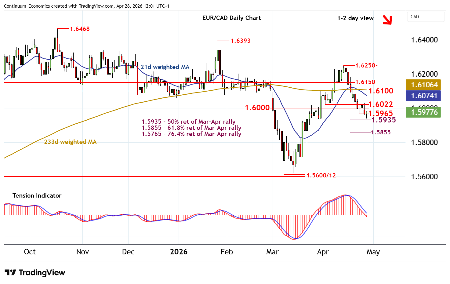 11:40 BST - The test below 1.5965 has bounced smartly from above the 1.5935 Fibonacci retracement, as oversold intraday studies flatten, with prices once again trading above 1.5965. Oversold daily stochastics are edging higher, suggesting room for a test of resistance at 1.6000. But the negative daily Tension Indicator and deteriorating weekly charts should prompt renewed selling interest towards here. A close above the 1.6022 lows of 2-6 April, however, would improve sentiment and give way to consolidation beneath 1.6100. Following cautious trade, fresh losses are looked for. But a close below 1.5935 is needed to turn sentiment negative and extend mid-April losses towards the 1.5855 retracement.