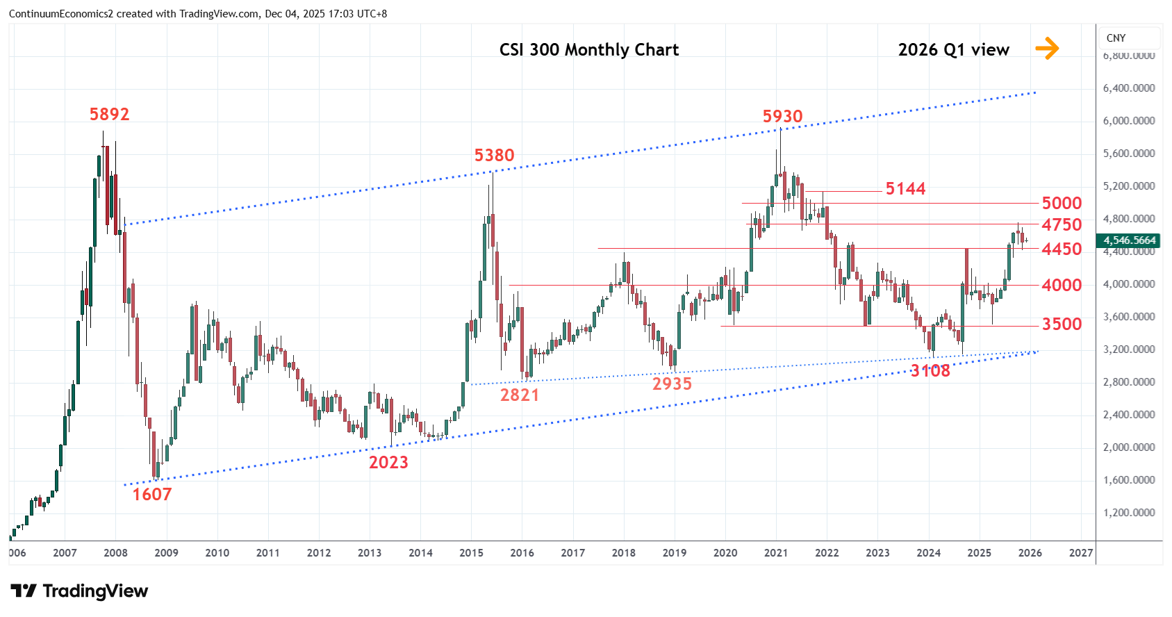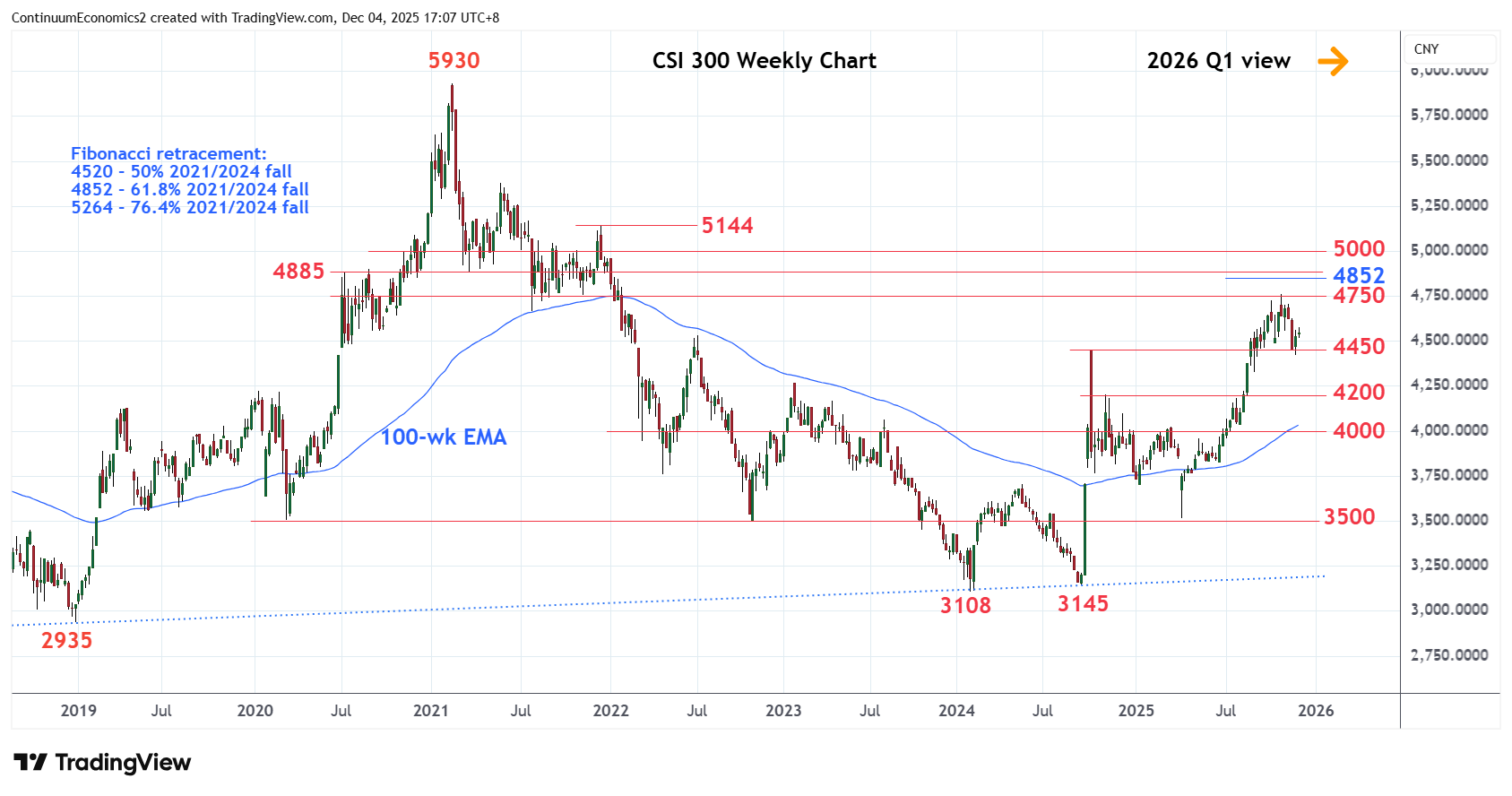 Saw gains to fresh year high at 4761 in Q4 before settling back in consolidation to support at 4450, the October 2024 year high