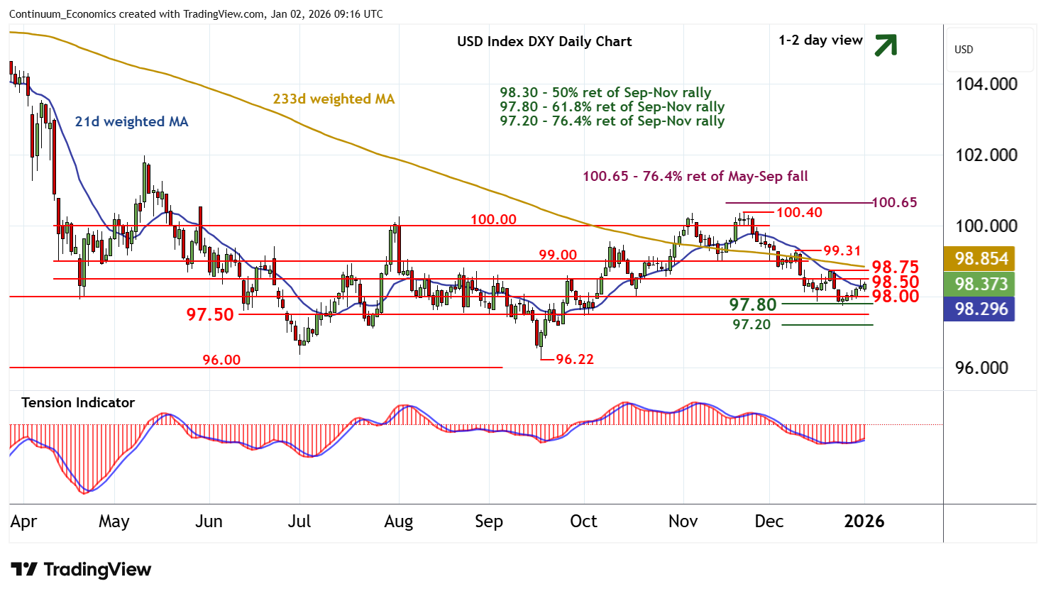 08:55 GMT - Little change, as mixed intraday studies keep near-term sentiment cautious and extend consolidation beneath congestion resistance at 98.50. A tick higher in daily readings highlights room for a test above here. But negative weekly charts are expected to limit initial scope in renewed consolidation beneath the 98.75 weekly high of 19 December. A further close above here, however, would improve sentiment and extend corrective gains towards further congestion around 99.00. Meanwhile, support remains at 98.00 and extends to the 97.80 Fibonacci retracement. This range should underpin any immediate setbacks.