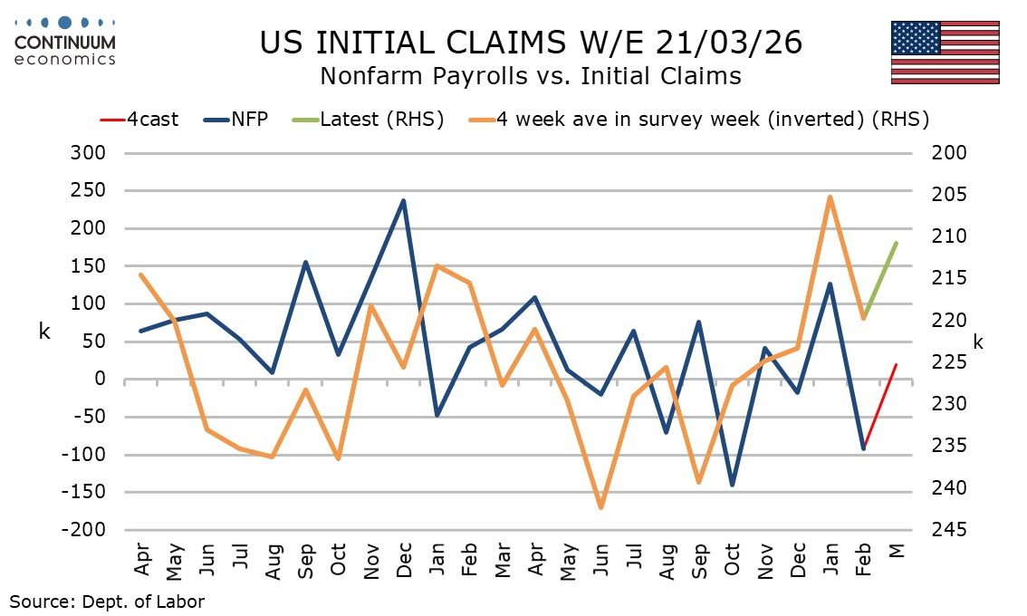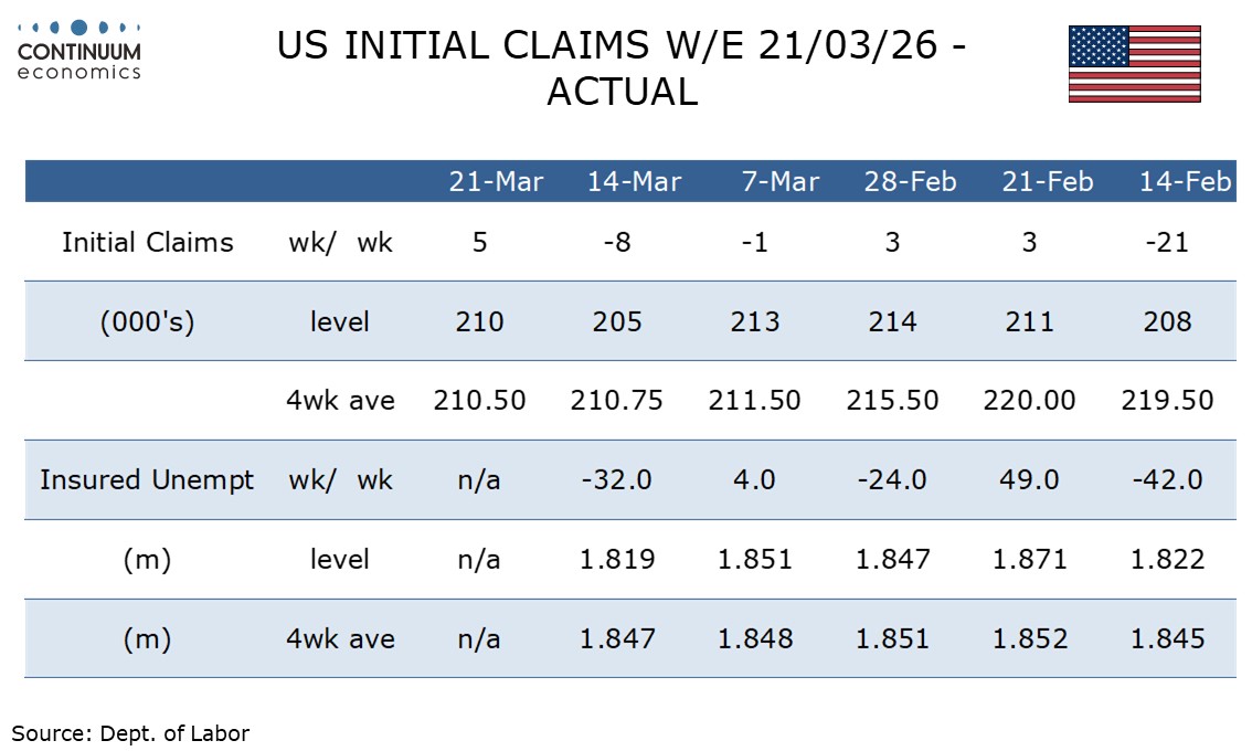 Initial claims are as expected at 210k, up by 5k from last week’s 9-week low. Continued claims at 1.819m are lower than expected, down by 32k and the lowest since September 2024, though trend remains fairly stable.