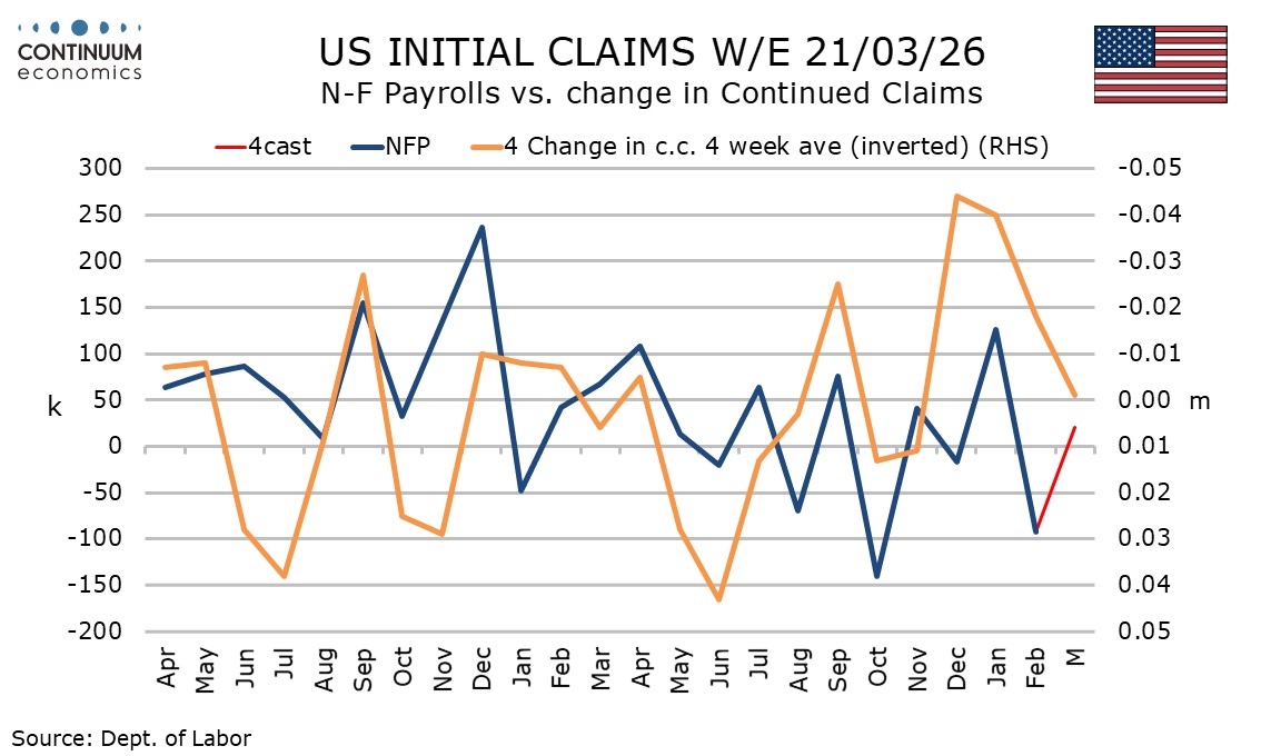 Last week’s initial claims and this week’s continued claims data cover the survey week for March’s non-farm payroll. Unusually mild weather in that week may have contributed to the declines.
