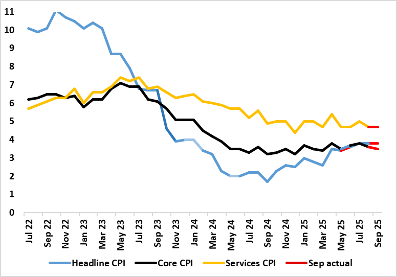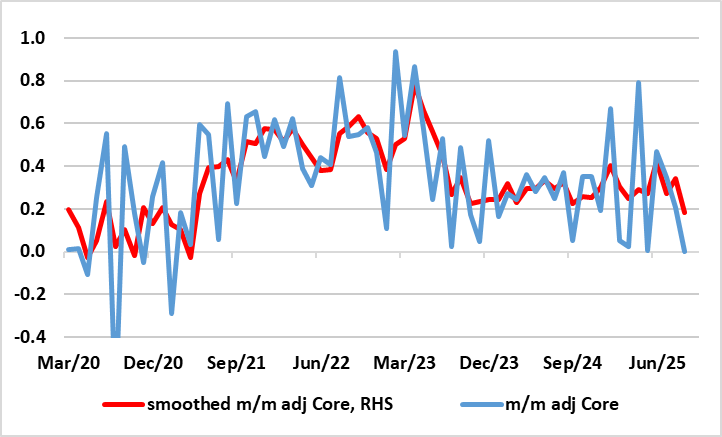 Changes in taxes and administered prices have raised headline inflation this year but are unlikely to be repeated next thereby creating favourable bae effect through 2026. This is one reason why shorter-term but adjusted m/m data are useful as they to not encompass price rises that took place months before and are unlikely to be repeated – Figure 2 shows a more reassuring picture for core inflation in this regard.