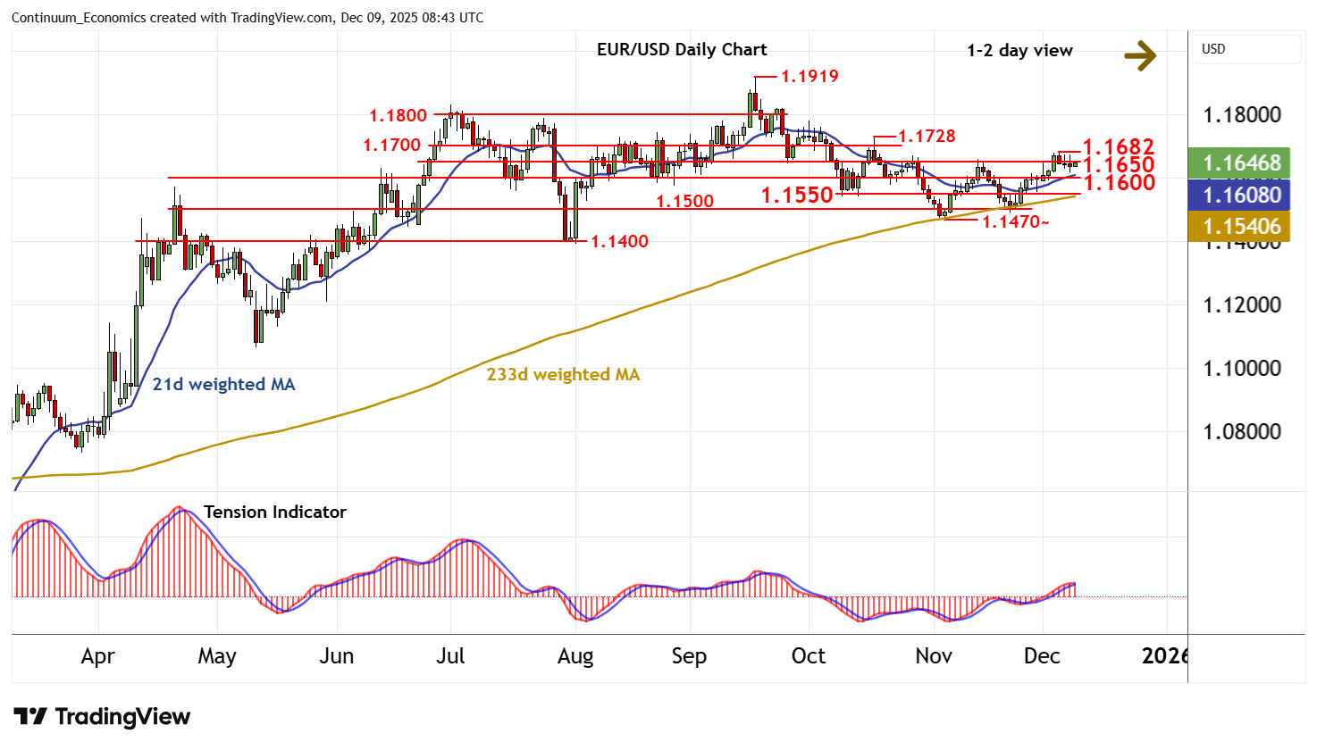 08:25 GMT - Little change, as mixed intraday studies keep near-term sentiment cautious and extend cautious/choppy trade beneath congestion resistance at 1.1650. Daily readings are under pressure, highlighting room for a drift lower and retest of congestion support at 1.1600. But rising weekly charts are expected to limit any further losses in renewed buying interest/consolidation above the 1.1550 break level. Following cautious trade, fresh gains are looked for. But a close above the 1.1682 weekly high of 4 December is needed to improve sentiment and extend November gains, initially into resistance within 1.1700/28.