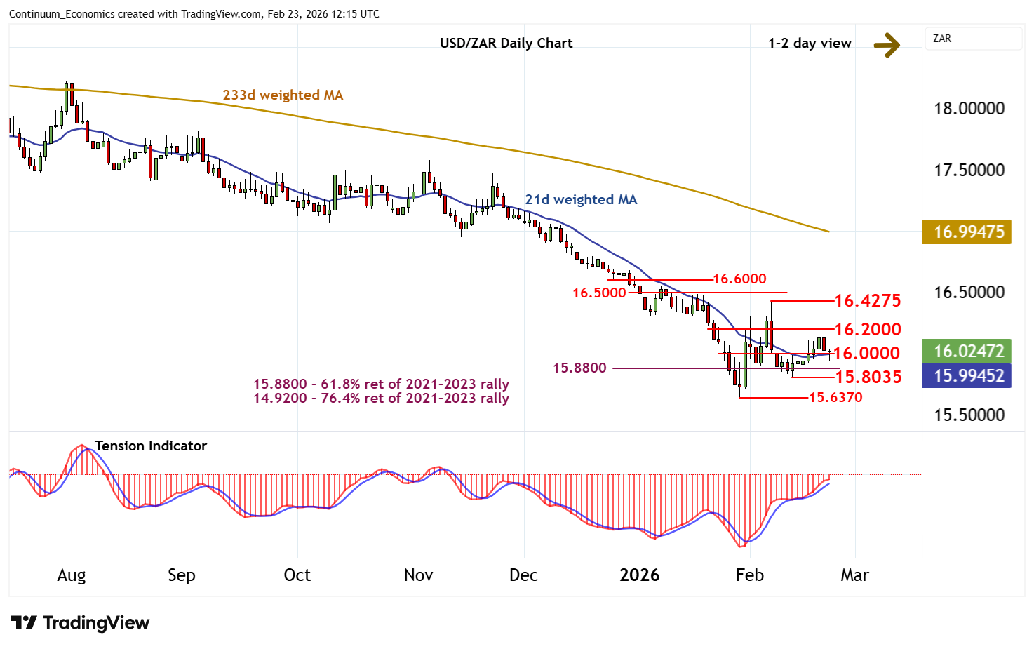 11:50 GMT - The pullback from congestion resistance at 16.2000 has tested below congestion support at 16.0000 to reach 15.9500, where a tick higher in oversold intraday studies is prompting a bounce back above 16.0000. Overbought daily stochastics are unwinding and the rising daily Tension Indicator is showing early signs of turning down, suggesting potential for a fresh test below 16.0000. Focus will then turn to the 15.8035 weekly low of 12 February. But rising oversold weekly stochastics should limit any initial tests in consolidation. Meanwhile, resistance remains at 16.2000 and should cap any immediate tests higher.