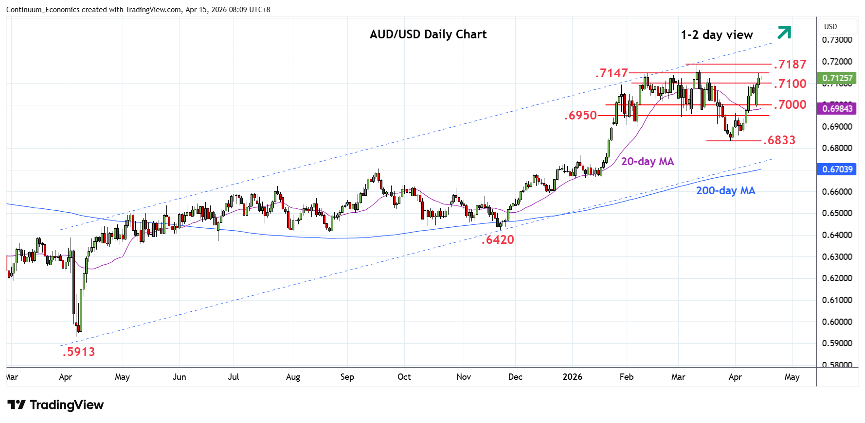 00:20 GMT - Break above the the .7100 level has seen gains to tag the .7147 February high before giving way to consolidation as daily studies stretches into overbought areas. Break here will see room to retest the .7187 March current year high and further extend the underlying bull trend from the April 2025 year low. Meanwhile, support is at the .7100/.7050 congestion area which should underpin. Below this will ease the upside pressure and leave the way open up deeper pullback to strong support at the .7000/.6950 area.
