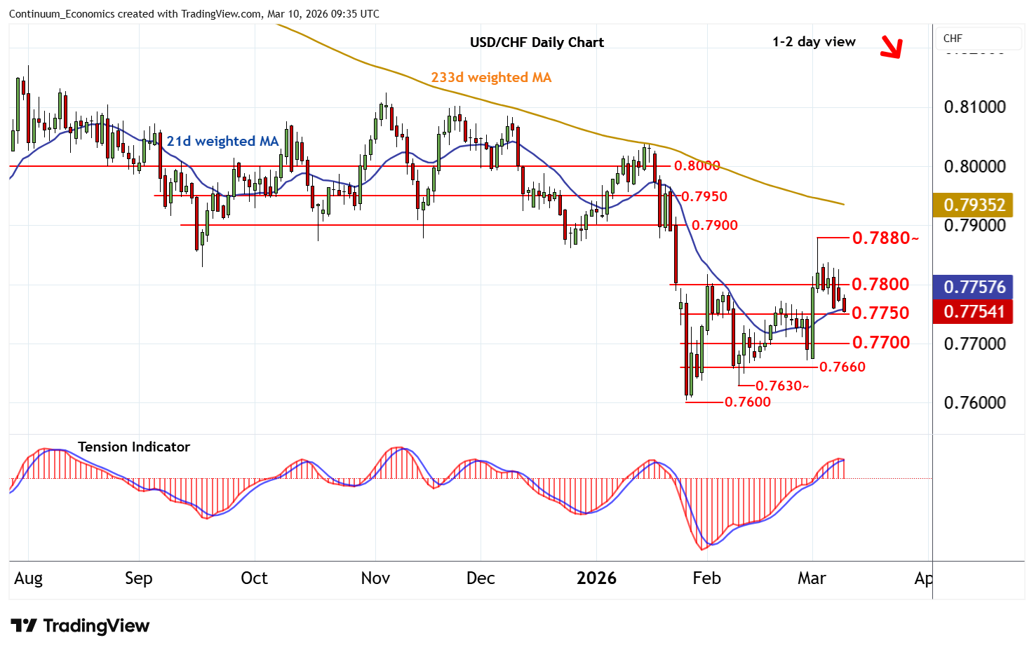 | R2 | 0.7880~/00 | * | 3 Mar high; cong | S3 | 0.7660 | congestion | ||