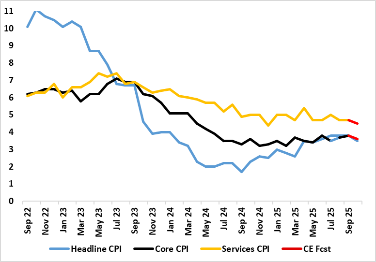 After the upside (and broad) June CPI surprise, CPI inflation rose further, up another 0.2 ppt to 3.8% in July and stayed there for the two following months, with the September outcome having been lower-than-expected outcome in what we (and the BoE) think will be the inflation peak. Indeed, we see that the October figure will drop a notch more than BoE thinking, to 3.5%, helped by favourable energy base effects, with the core rate seen dropping 0.1 ppt to a ten-month low of 3.3% (Figure 1). Other base effects may mean food inflation being stable after a clear and belated fall in September. After some further aberrant factors, services inflation in September stayed at 4.7% bolstered again by airfares, but should unwind in October, partly explaining the anticipated fall in the core rate. Notably, in adjusted terms of late (Figure 2), a clear fall may be occurring as far as underlying inflation is concerned, this also evident in regard to services (Figure 3).