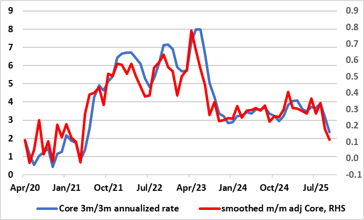 On this basis, we suggest that the underlying disinflationary process towards target is not only intact but being overlooked, justifying more than a continued “gradual and careful” withdrawal of monetary policy restriction as did four members of the MPC this month. We still see 75 bp of rate cuts ahead, including an increasingly likely move in December, this helped by a fall in the headline rate to possibly just under 3% in Q1 next year.