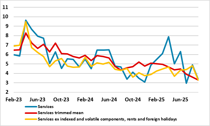 Changes in taxes and administered prices have raised headline inflation this year but are unlikely to be repeated next thereby creating favourable base effect through 2026, with maybe moves in the opposite direction given suggestions of lower VAT on energy. This is one reason why shorter-term but adjusted m/m data are useful as they to not encompass price rises that took place months before and are unlikely to be repeated – Figure 2 shows a more reassuring picture for core inflation in this regard. In fact, the BoE also now employ some use of such short-term adjusted data, showing services price pressures having dropped sharply of late (Figure 3).