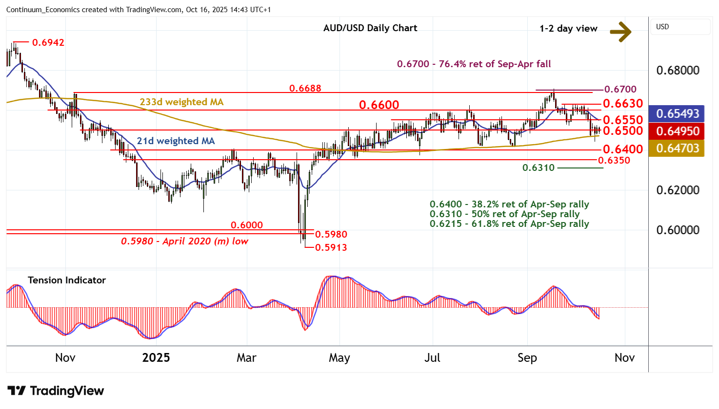 14:35 BST - Little change, as prices extend consolidation around congestion support at 0.6500. Rising daily stochastics are flattening and the daily Tension Indicator continues to track lower, highlighting room for fresh losses in the coming sessions. A break below 0.6500 will open up the 0.6440 low of 14 October. Negative weekly charts suggest potential for continuation down to stronger support at congestion around 0.6400, where by-then oversold daily stochastics could prompt consolidation. Meanwhile, congestion resistance at 0.6550 should cap any immediate tests higher.