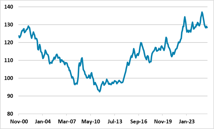 The healthy inflows have not resulted in a higher USD in 2025 however. The U.S. current account deficit is likely to be around USD1200bln in 2025, while net foreign and U.S. security flows have been USD1190bln in the 12mth to September 2025 according to the TICS data. Anecdotal reports have also suggested that foreign investors in U.S. securities have also been more active in hedging U.S. bond and equity risk in 2025 than 2024, which has been a factor weakening the USD. The October IMF GSFR (Figure 2) noted that Optimal Volatility Minimizing FX Hedge Ratio had increased.