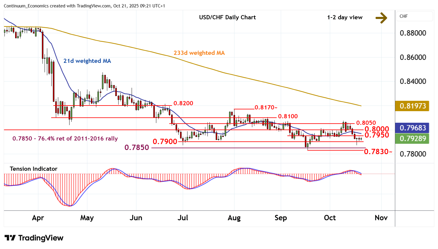 09:15 BST - Little change, as mixed intraday studies keep near-term sentiment cautious and extend consolidation around 0.7925. Oversold daily stochastics are flattening, suggesting room for a move towards resistance at 0.7950. But the negative daily Tension Indicator and mixed/negative weekly charts should limit any break in renewed selling interest beneath congestion around 0.8000. Following cautious trade, fresh losses are looked for. A later break back below congestion support at 0.7900 will add weight to sentiment and open up critical support at the 0.7850 Fibonacci retracement and the 0.7830~ current year low of 17 September.