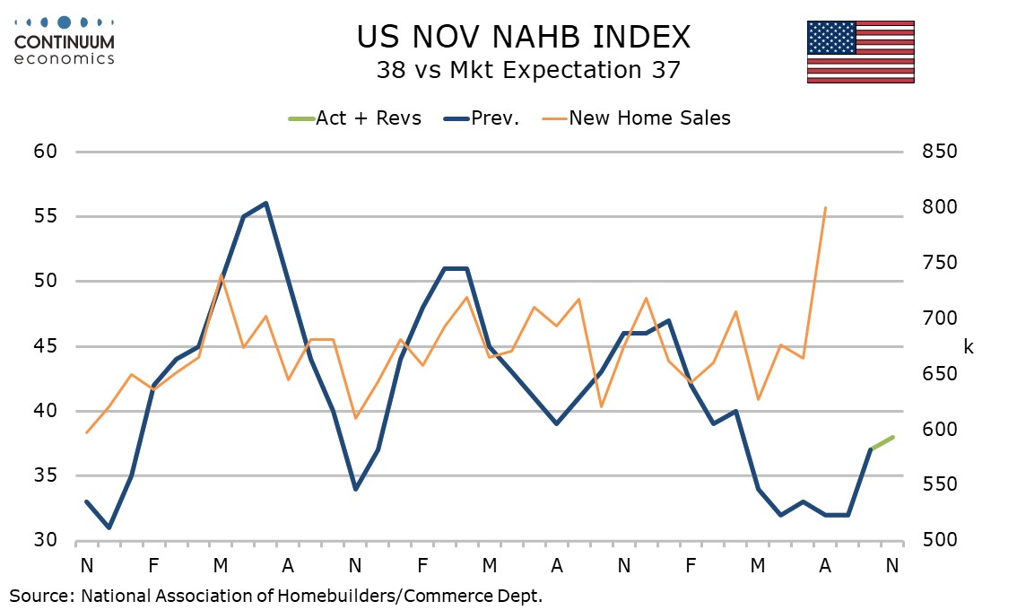 November’s NAHB homebuilders’ index of 38 has marginally extended a 5-point October bounce and remains at its highest level since April. Details show increasing strength in current month data but a correction lower in the 6-month view.